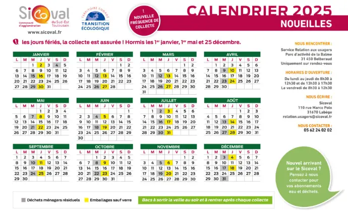 La collecte des déchets est assurée sur la commune par le Sicoval. Retrouvez sur leur site le calendrier de collecte de l'année en cours.